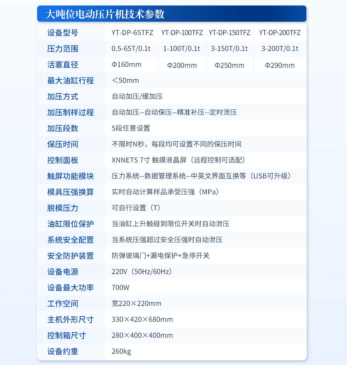 设备型号:YT-DP-20T | 压力范围:0.2-20T/0.1t | 活塞直径:Φ95mm | **活塞行程:<30mm | 控制面板:XNNETS 4.3寸 触摸液晶屏 | 加泄压方式:电动加压/缓加压/自动补压,手动泄压 | 保压时间:手动控制 | 压力稳定性:≤1MPa/10min | 设备电源:220V(50Hz/60Hz) | 设备**功率:400W | 油缸限位保护:当油缸上升触碰到限位开关时自动泄压 | 安全防护装置:漏电保护+急停开关 | 工作台直径:Ф105mm | 工作空间 宽80×150mm | 外形尺寸:245×415×415mm | 设备约重:70kg | 配置说明:压片机1台,模具选配!可根据需求定制压片机或模具 |
