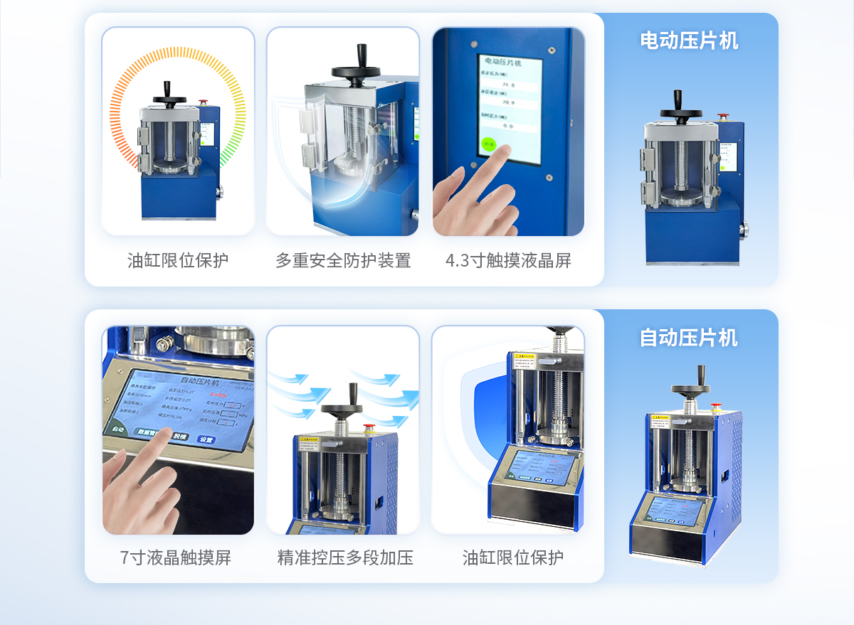 该机相比手动压片机,工作效率大大提高,4.3寸触摸液晶屏直接显示压力吨位;配以特定模具,可将各种粉末样品压制成试片用于科学研究分析检测等,也可作为普通压力机使用,应用极其广泛。