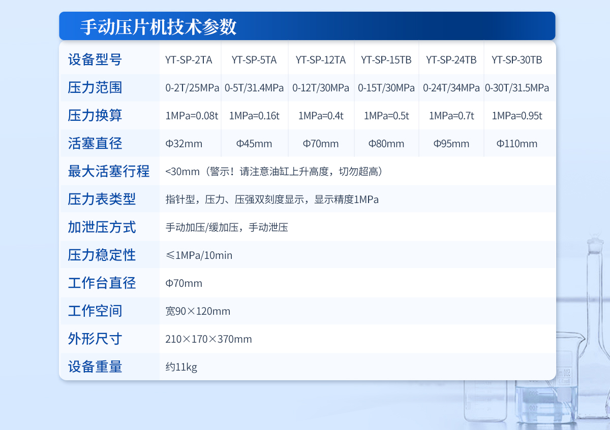 设备型号:YT-DP-60TF | 压力范围:0.5-60T/0.1t | 活塞直径:Φ150mm | **活塞行程:<50mm | 控制面板:XNNETS 4.3寸 触摸液晶屏 | 加泄压方式:电动加压/缓加压/自动补压,手动泄压 | 保压时间:手动控制 | 压力稳定性:≤1MPa/10min | 设备电源:220V(50Hz/60Hz) | 设备**功率:400W | 油缸限位保护:当油缸上升触碰到限位开关时自动泄压 | 安全防护装置:防弹玻璃门+漏电保护+急停开关 | 工作台直径:Ф160mm | 工作空间:宽180×200mm | 外形尺寸:405×470×565mm | 设备约重:140kg | 配置说明:压片机1台,模具选配!可根据需求定制压片机或模具 |