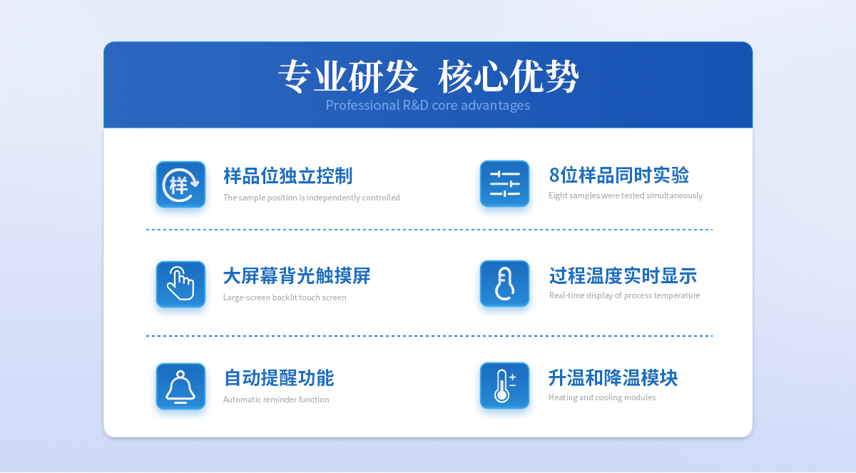 ◆ 全样品位:8位, | ◆ 样品位可独立控制:每个样品位独立控制,*多实现8位样品同时实验。 | ◆ 恒温控制功能:**的升温和降温模块,自动控制实验操作在恒温25℃下进行,实验过程温度实时显示。 | ◆ 测量提醒功能:到达检测条件后自动提醒功能,保证每次实验的及时进行。 | ◆ 控温精度:25℃±1℃ | ◆ 大屏幕背光触摸屏,方便直观操作。 |