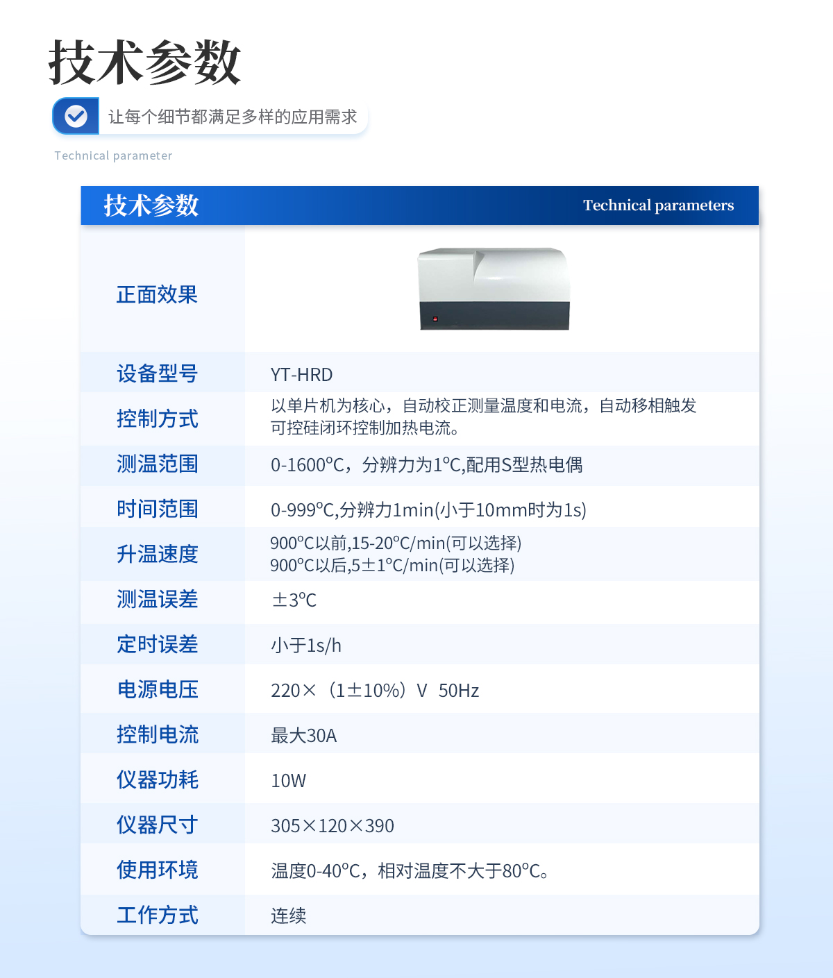 1、控制方式:以单片机为核心,自动校正测量温度和电流,自动移相触发可控硅闭环控制加热电流。 | 2、测温范围:0-1600ºC,分辨力为1ºC,配用S型热电偶. | 3、时间范围:0-999ºC,分辨力1min(小于10mm时为1s) | 4、升温速度:900ºC以前,15-20ºC/min(可以选择).900ºC以后,5±1ºC/min(可以选择) | 5、测温误差:±3ºC | 6、定时误差:小于1s/h | 7、电源电压:220×(1±10%)V 50Hz | 8、控制电流:**30A | 9、仪器功耗:10W | 10仪器尺寸(mm):305×120×390 | 11、使用环境:温度0-40ºC,相对温度不大于80ºC | 12、工作方式:连续 |