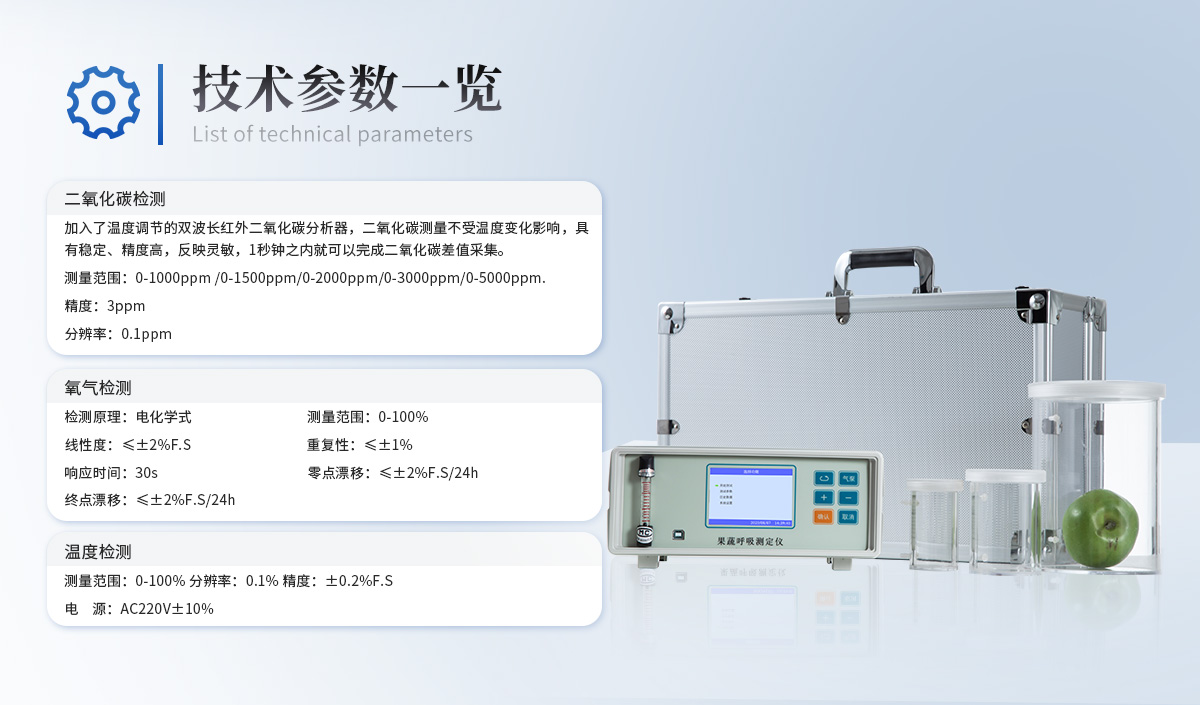 测量范围:0-100% 分辨率:0.1% 精度:±0.2%F.S | 电 源:AC220V±10% | 预热时间:30分钟 | 标配三种呼吸室尺寸: | 1、内径40mm的净空间80mm 容积为0.1升 | 2、内径60mm的净空间89mm 容积为0.25升 | 3、内径120mm的净空间180mm 容积为2升 | 其它尺寸的呼吸室用户可根据自己的需求单独订购 |