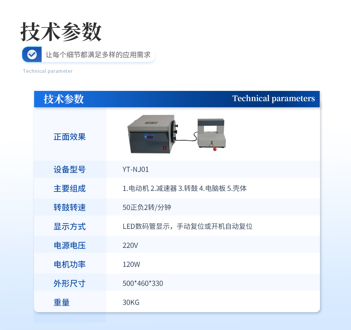1.转鼓转速 50正负2转/分钟 | 2.显示方式 LED数码管显示,手动复位或开机自动复位 | 3.电源电压 220V | 4.电机功率 120W | 5.外形尺寸 500*460*330 | 6.重量 30KG |