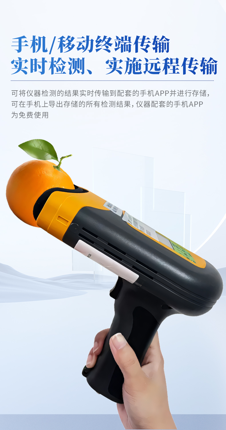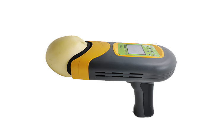 果实内部品质无损检测仪,使用近红外光谱分析原理, 对果实内部成分含 量进行预测。仪器由近红外光谱仪、光源、处理器、显示屏等组成。仪器光源发出近红外光,使果实内部的分子振动并发生能级跃迁,进而产生近红外光谱,因为近红外光谱和果实品质方面的成分含量具有相关性(如糖度、干物质等),可通过数学算法建立相关品质信息的预测模型,因此,在预测未知的水果样品时,只需要使用无损检测仪去扫描它,获取它的光谱信息,即可通过模型提供该水果样品的品质预测结果。