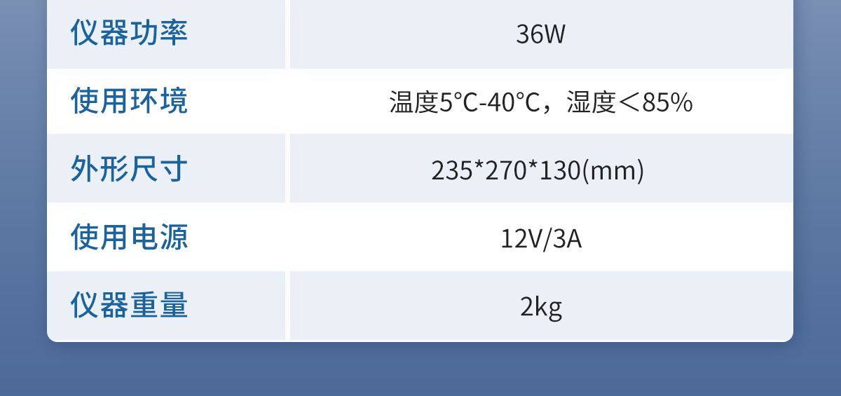 | 1.测量范围:0.01%至100% | 2.灵 敏 阈:0.01ug | 3.准 确 度:对于5μg-1mg为±2μg,对于1mg以上,为0.2%(不含进样误差) | 4.重 复 性:≤2% | 5.电解速度:2min | 6.搅拌速度:1-10档(可调) | 7.零点平衡时间:1min | 8.仪器功率:36W | 9.使用环境:温度5℃-40℃,湿度<85% | 10.外形尺寸:235*270*130(mm) | 11.使用电源:12V/3A | 12.仪器重量:2kg |