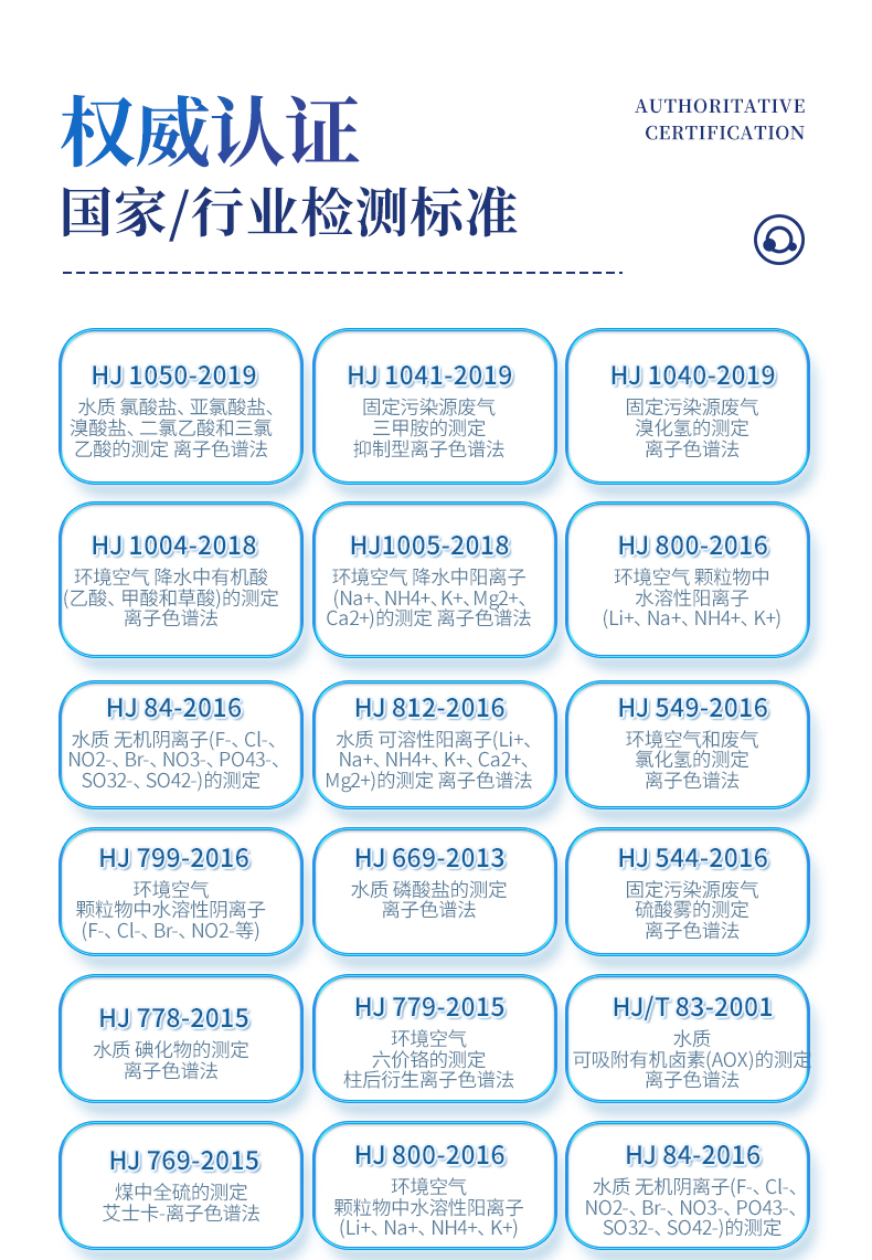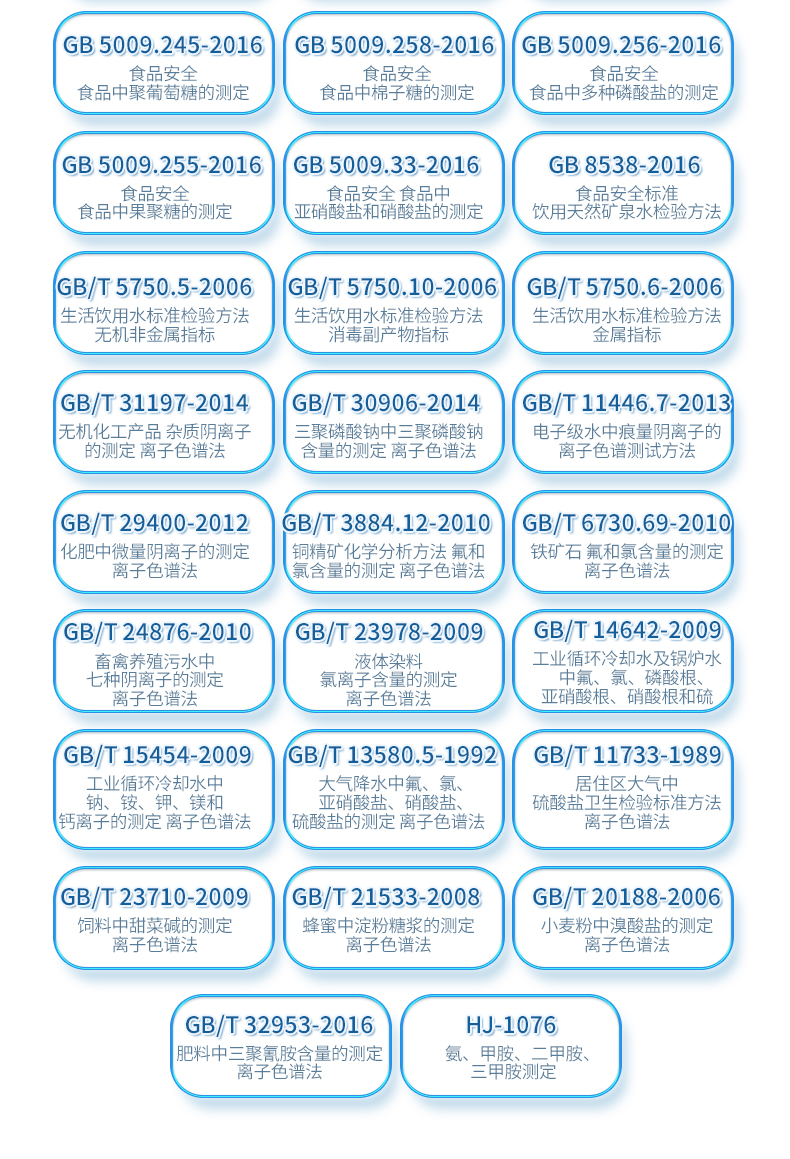 | HJ 1050-2019 水质 氯酸盐、亚氯酸盐、溴酸盐、二氯乙酸和三氯乙酸的测定 离子色谱法 | HJ 1041-2019 固定污染源废气 三甲胺的测定 抑制型离子色谱法 | HJ 1040-2019 固定污染源废气 溴化氢的测定 离子色谱法 | HJ 1004-2018 环境空气 降水中有机酸(乙酸、甲酸和草酸)的测定 离子色谱法 | HJ1005-2018 环境空气 降水中阳离子(Na+、NH4+、K+、Mg2+、Ca2+)的测定 离子色谱法 | HJ 800-2016 环境空气 颗粒物中水溶性阳离子(Li+、Na+、NH4+、K+) | HJ 84-2016 水质 无机阴离子(F-、Cl-、NO2-、Br-、NO3-、PO43-、SO32-、SO42-)的测定 | HJ 812-2016 水质 可溶性阳离子(Li+、Na+、NH4+、K+、Ca2+、Mg2+)的测定 离子色谱法 | HJ 549-2016 环境空气和废气 氯化氢的测定 离子色谱法 | HJ 799-2016 环境空气 颗粒物中水溶性阴离子(F-、Cl-、Br-、NO2-等) | HJ 669-2013 水质 磷酸盐的测定 离子色谱法 | HJ 544-2016 固定污染源废气 硫酸雾的测定 离子色谱法 | HJ 778-2015 水质 碘化物的测定 离子色谱法 | HJ 779-2015 环境空气 六价铬的测定 柱后衍生离子色谱法 | HJ/T 83-2001 水质 可吸附有机卤素(AOX)的测定 离子色谱法 | HJ 769-2015 煤中全硫的测定 艾士卡-离子色谱法 | HJ 800-2016 环境空气 颗粒物中水溶性阳离子(Li+、Na+、NH4+、K+) | HJ 84-2016 水质 无机阴离子(F-、Cl-、NO2-、Br-、NO3-、PO43-、SO32-、SO42-)的测定 | GB 5009.245-2016 食品安全 食品中聚葡萄糖的测定 | GB 5009.258-2016 食品安全 食品中棉子糖的测定 | GB 5009.256-2016 食品安全 食品中多种磷酸盐的测定 | GB 5009.255-2016 食品安全 食品中果聚糖的测定 | GB 5009.33-2016 食品安全 食品中亚硝酸盐和硝酸盐的测定 | GB 8538-2016 食品安全标准 饮用天然矿泉水检验方法 | GB/T 5750.5-2006 生活饮用水标准检验方法 无机非金属指标 | GB/T 5750.10-2006 生活饮用水标准检验方法 消毒副产物指标 | GB/T 5750.6-2006 生活饮用水标准检验方法 金属指标 | GB/T 31197-2014 无机化工产品 杂质阴离子的测定 离子色谱法 | GB/T 30906-2014 三聚磷酸钠中三聚磷酸钠含量的测定 离子色谱法 | GB/T 11446.7-2013 电子级水中痕量阴离子的离子色谱测试方法 | GB/T 29400-2012 化肥中微量阴离子的测定 离子色谱法 | GB/T 3884.12-2010 铜精矿化学分析方法 第12部分:氟和氯含量的测定 离子色谱法 | GB/T 6730.69-2010 铁矿石 氟和氯含量的测定 离子色谱法 | GB/T 24876-2010 畜禽养殖污水中七种阴离子的测定 离子色谱法 | GB/T 23978-2009 液体染料 氯离子含量的测定 离子色谱法 | GB/T 14642-2009 工业循环冷却水及锅炉水中氟、氯、磷酸根、亚硝酸根、硝酸根和硫 | GB/T 15454-2009 工业循环冷却水中钠、铵、钾、镁和钙离子的测定 离子色谱法 | GB/T 23710-2009 饲料中甜菜碱的测定 离子色谱法 | GB/T 21533-2008 蜂蜜中淀粉糖浆的测定 离子色谱法 | GB/T 20188-2006 小麦粉中溴酸盐的测定 离子色谱法 | GB/T 13580.5-1992 大气降水中氟、氯、亚硝酸盐、硝酸盐、硫酸盐的测定 离子色谱法 | GB/T 32953-2016 肥料中三聚氰胺含量的测定 离子色谱法 | GB/T 11733-1989 居住区大气中硫酸盐卫生检验标准方法 离子色谱法 | HJ-1076 氨、甲胺、二甲胺、三甲胺测定 |