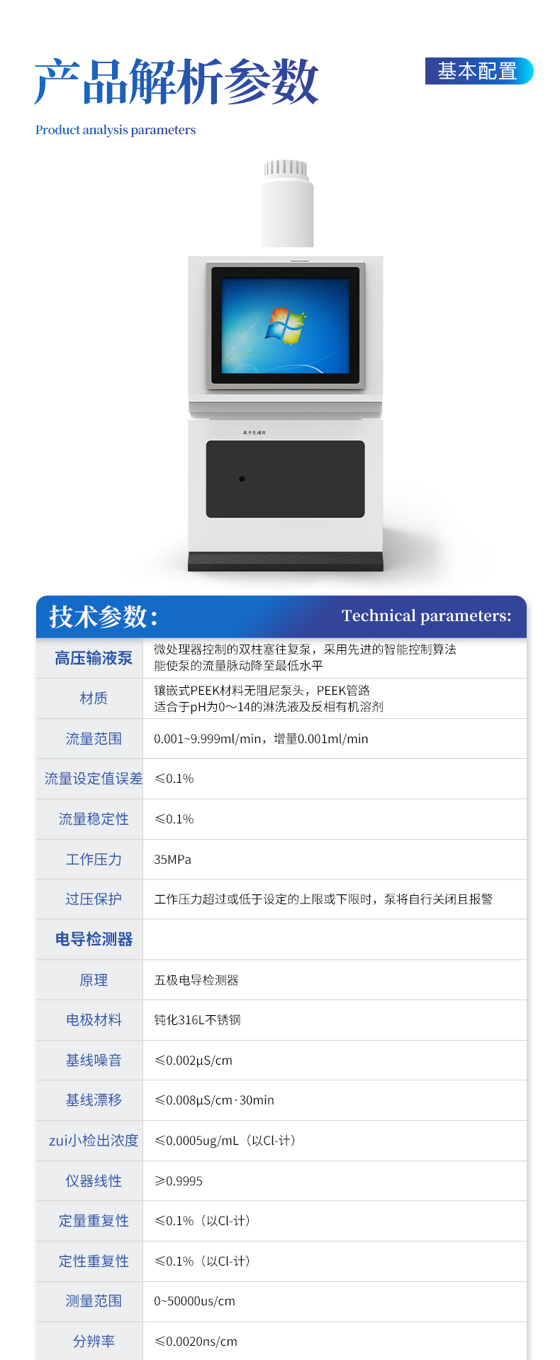 微处理器控制的双柱塞往复泵,采用**的智能控制算法,能使泵的流量脉动降至**水平。 1.1,材质:镶嵌式PEEK材料无阻尼泵头,PEEK管路,适合于pH为0~14的淋洗液及反相有机溶剂。 1.2,流量范围:0.001~9.999ml/min,增量0.001ml/min。 1.3,流量设定值误差:≤0.1% 1.4,流量稳定性:≤0.1% 1.5,工作压力:35MPa 1.6,过压保护:工作压力超过或低于设定的上限或下限时,泵将自行关闭且报警。 | 2 电导检测器: 2.1,原理:五极电导检测器 2.2,电极材料:钝化316L不锈钢 2.3,基线噪音:≤0.002μS/cm 2.4,基线漂移:≤0.008μS/cm·30min 2.5,zui小检出浓度:≤0.0005ug/mL(以Cl-计) 2.6,仪器线性:≥0.9995 2.7,定量重复性:≤0.1%(以Cl-计) 2.8,定性重复性:≤0.1%(以Cl-计) 2.9,测量范围:0~50000us/cm 2.10,分辨率:≤0.0020ns/cm 2.11,检测池体积:0.8uL 2.12,操作压力:≤10Mpa。 2.13,电导检测量程: 0-50000uS,10档可调。 | 3、 阴、阳离子抑制器: 3.1连续自动再生电化学微膜抑制器,在线自动再生,高抑制容量,低背景电导,低噪声,基线稳定,免维护。 3.2抗污染,耐压好,寿命长,使用范围广(PH0-14)。 3.3体积小,稳定时间快,稳定时间不大于12分钟,且重现性好。 | 4 流路系统: 4.1流路系统使用PEEK材料制造,通用性好,能使用强酸、强碱的淋洗液。 4.2百分之百的有机溶剂兼容,方便用户对复杂样品进行分析、冲洗和维护。 4.3 结构紧凑,流路*短,对流路造成的峰型扩展有很好的改善。 4.4 内置多处漏液报警器和缺水报警器,全方位安全监控。 | 5 内置色谱工作站: 5.1 24位高精度高灵敏度数模转换。 5.2专用离子色谱工作站,全中文显示,通过USB方式与电脑进行数字信号传输,完成色谱数据采集及处理。 5.3自动接收分析和控制保存仪器色谱条件。 5.4自动识别负峰、基线扣除功能。自动积分参数、自动生成报告。 | 6 色谱柱、抑制器、电导池、放大电路一体恒温系统: 将电导池、流路系统、分离柱、抑制器、放大电路恒温在同一个控温基体上置于柱箱内,恒温精度5~65℃±0.01℃。并且仪器柱箱采用绝热结构,可保持检测系统、流路及柱子、抑制器、电导池、放大电路的温度恒定,获得高质量的分离效果和检测精度,改善了电导检测器的温飘和基线噪声。 | 7内置淋洗液发生器,仅用高纯水,无需人工配制任何化学试剂,在线产生等度或梯度高纯淋洗液,减少基线漂移,提高稳定性,简化工作流程。 | 8 在线自动脱气系统: 1,脱气效率:在25℃入口流动相的含氧量为8PPM时,出口流动相的含氧量为2PPM (流速:1.5ml\min) 2,真空压力:-0.018MPa 3,流量:5mL/min | 9 分离能力:(分别配置不同的阴、阳离子分离柱,可以分离的离子种类:) 配置国产阴离子分离柱:一次进样分析:氟化物、氯化物、亚硝酸盐、磷酸盐、溴化物、硝酸盐、硫酸盐 配置进口阴离子分离柱:一次进样分析:氟化物、溴酸盐、氯化物、亚硝酸盐、磷酸盐、溴化物、硝酸盐、硫酸盐、亚氯酸盐、高氯酸盐、二氯乙酸、三氯乙酸等 配置进口阳离子分离柱:一次进样分析::Li+、Na+、NH4+、K+、Ca2+、Mg2+、Sr2+、Ba2+等 | 10 重量:30kg左右 尺寸mm:长500,宽400,高600 |