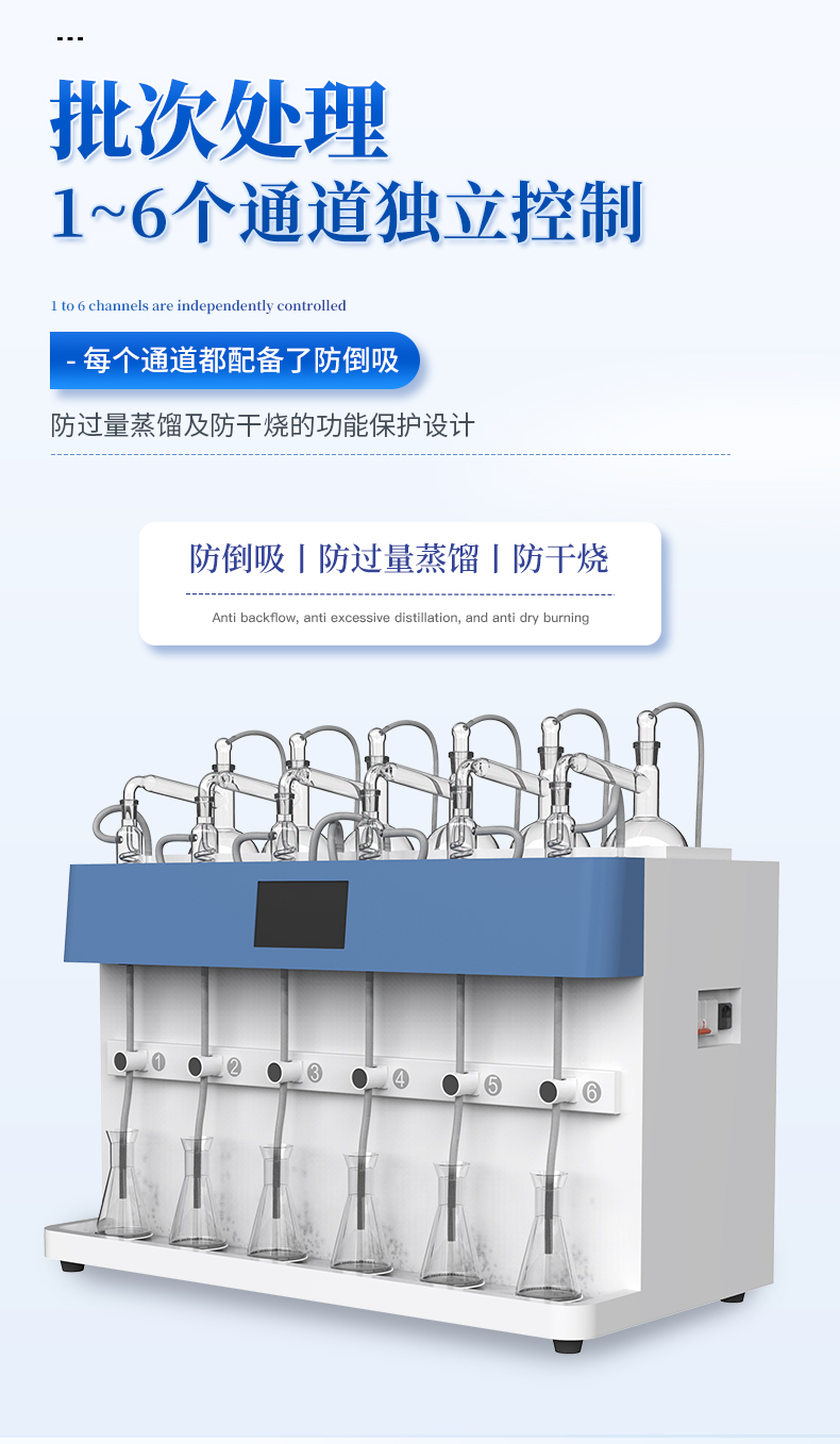 | 1.自动化程度高:内置冷却水循环机,实现全自动化操作,提高实验效率与准确性。 | 2.多通道独立控制:3个加热单元各自独立,配备防倒吸、防过量蒸馏及防干烧保护。 | 3.智能触控:7寸液晶触摸屏,支持自定义保存*多1000种蒸馏方法,内置18种国标方法。 | 4.精准控制:采用**陶瓷远红外加热,具备时间与重量双重终点控制,确保蒸馏精度达0.1ml。 | 5.安全可靠:集成自动清洗、自动气密检查、反吹等功能,确保设备长期稳定运行。 | 6.操作简便:一键启动,支持远程OTA系统升级,满足不同用户的使用需求。 |