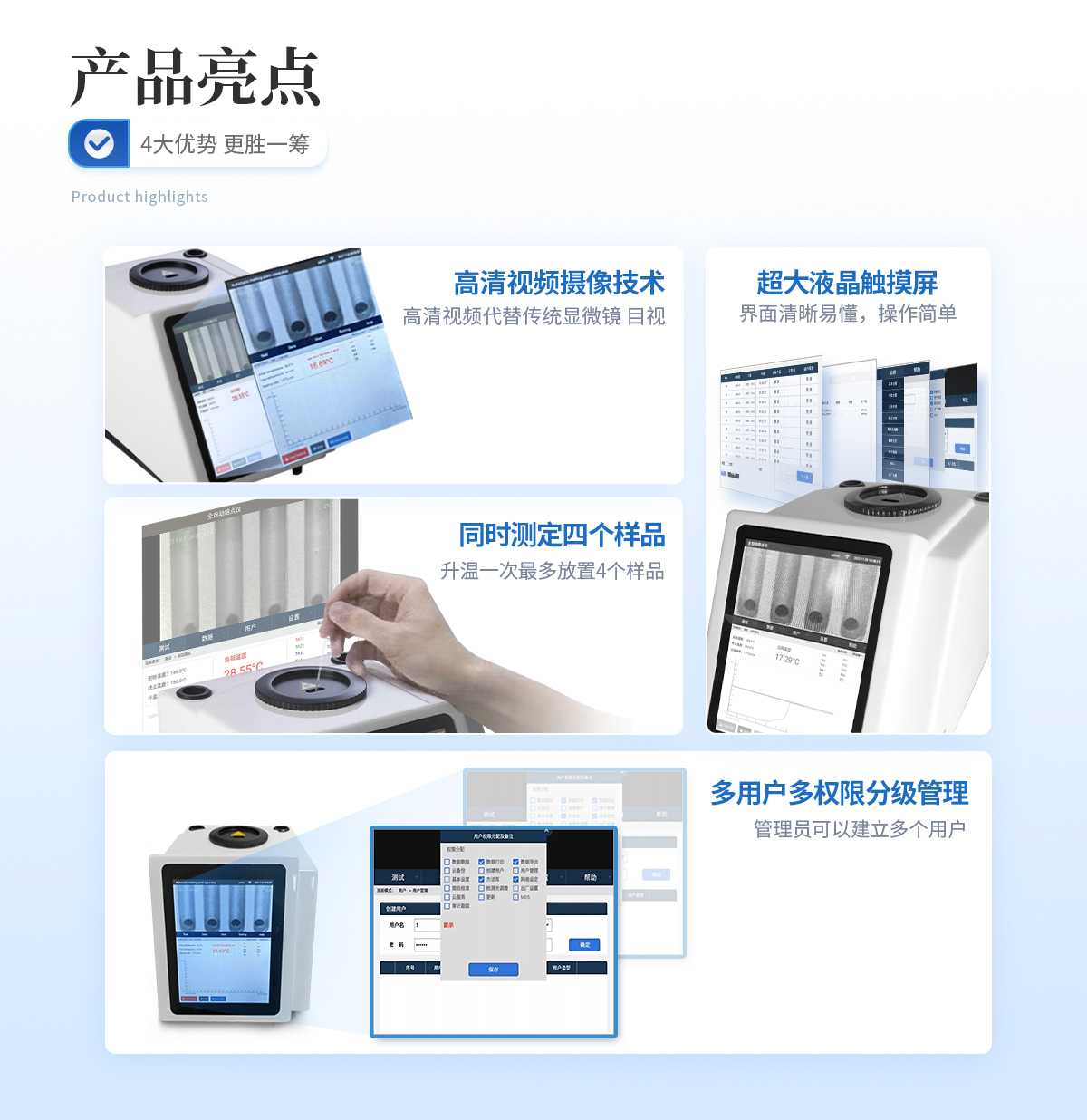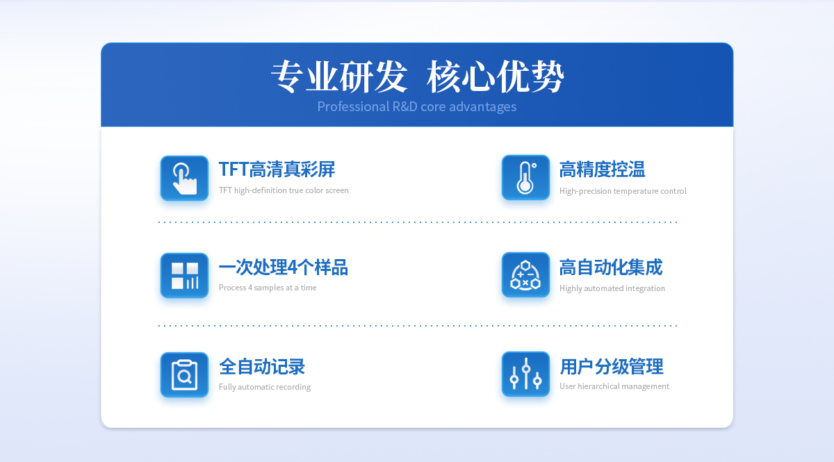 | 1、自动化集成,实现一键测定功能; | 2、一次处理4个样品; | 3、高清视频代替传统显微镜 目视高; | 4、半自动记录熔程,初熔,终熔; | 5、可通过打印机直接打印数据; | 6、符合21CFR Part 11、审计追踪、药典及电子签名 | 7、符合GLP要求规范; | 8、符合药典2015。 |