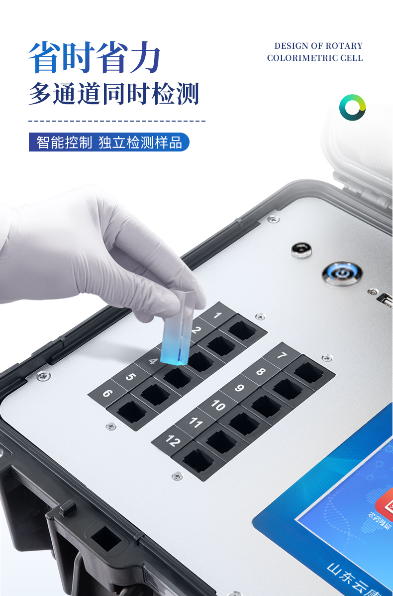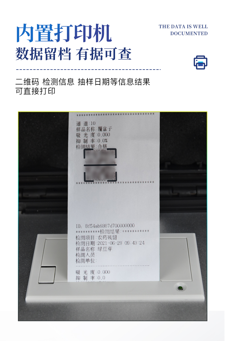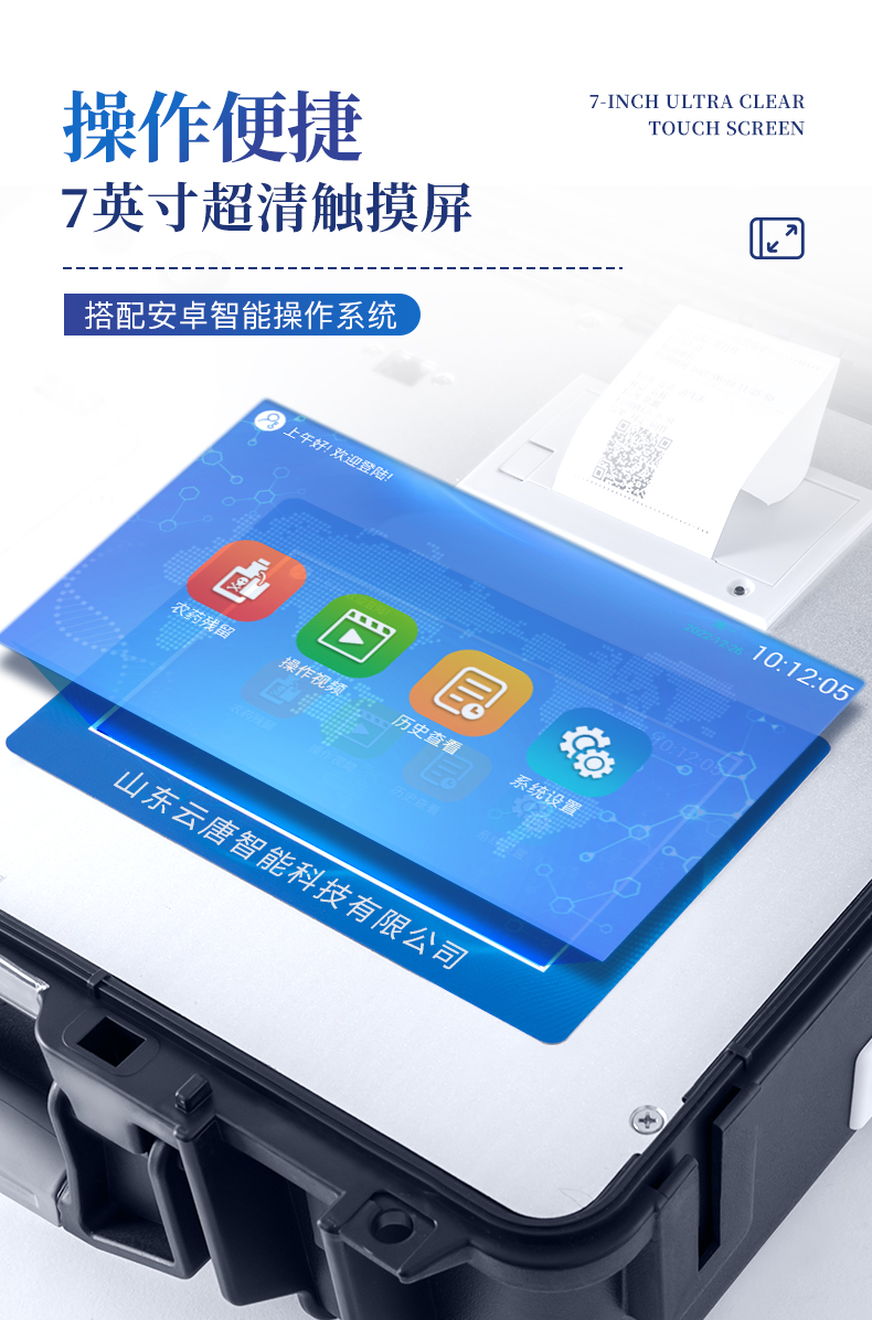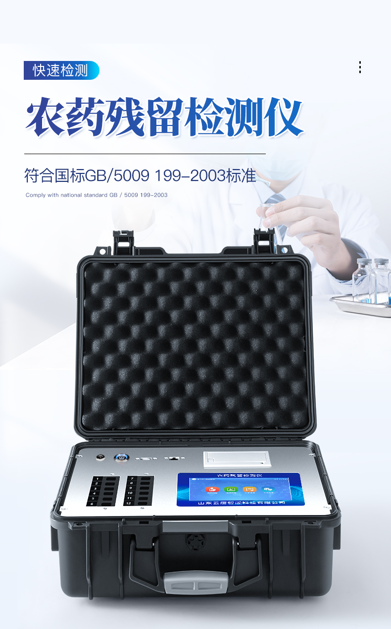| 机箱采用工业级ABS工程塑料箱,方便携带,稳固耐用,便于流动测试。 | 智能操作系统,采用更加人性化操作,主控采用多核处理器,主频1.88Ghz,运转速度更快速,稳定性更强。 | 自动判断样品是否合格,检测结果更加直观。 | 仪器具有100多种蔬菜名称菜单库,分类管理,并可按需添加或删除蔬菜名,编辑蔬菜名称,可直接打印出蔬菜名称。 | 检测通道:6个检测通道,可以同时测试多个样品,循环检测,即放即检,每个样品由程序控制分别独立工作,不会互相干扰。 | 仪器具有wifi联网功能,可将数据快速上传电脑,进行数据管理与统计,4G信号GPRS远传功能,可插手机卡实现数据远传平台,。 | 显示方式:7英寸高灵敏真彩触摸屏显示,人性化中文操作界面,读数直观、简单。 | 打印机采用串口5v打印,可选择手动打印或者自动打印,三分钟出打印结果,打印格式为检测人姓名、吸光度差值、检测时间、检测机构、样品名称及结果判定。 | 光源采用进口超高亮发光二极管,具有低功耗、高精度、稳定性强、光源可控可以关掉不使用的光源,响应速度快等优点。 | 智能恒流稳压,光强自动校准,长时间连续工作光源无温漂现象。 | 采用USB2.0接口设计,方便数据的存贮和移动,并可随时与计算机直接相连,并且可用计算机控制仪器。实现数据查询、浏览、分析、统计、打印等。 | 智能化程度高,仪器具有自检功能:具有开机自检和调零功能,具有自动检测重复性功能 | 仪器具有自身保护功能,可设置用户名及密码,防止非工作人员操作等。 | 采用DC12v直流供电,安全系统更高,并且配备6A锂电池充电器。 | 仪器具有重新校准、锁定、恢复出厂设置功能。 |