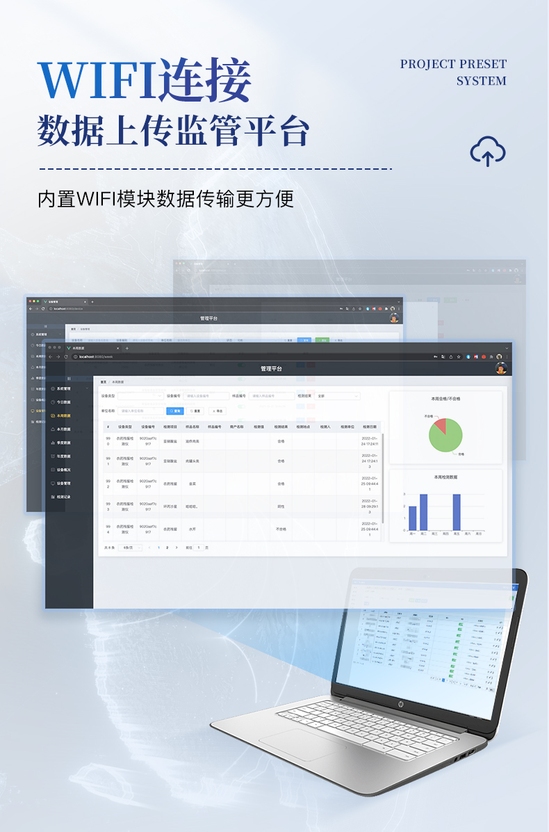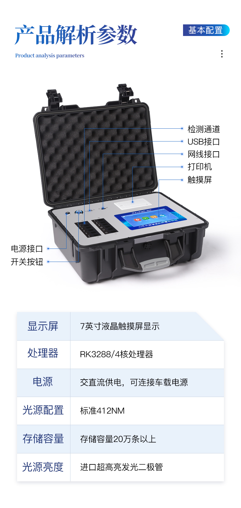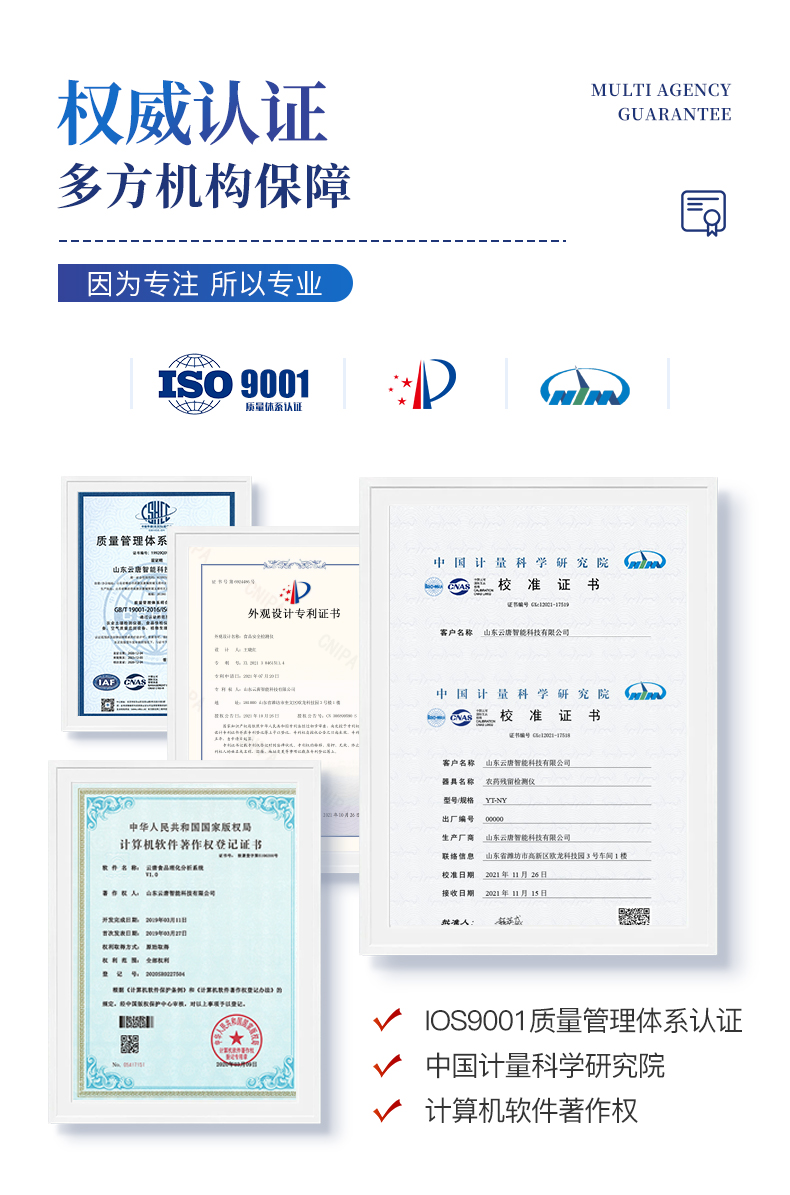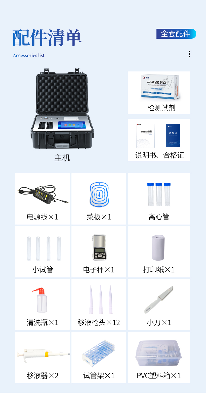 | 机箱采用工业级ABS工程塑料箱,方便携带,稳固耐用,便于流动测试。 | 智能操作系统,采用更加人性化操作,主控采用多核处理器,主频1.88Ghz,运转速度更快速,稳定性更强。 | 自动判断样品是否合格,检测结果更加直观。 | 仪器具有100多种蔬菜名称菜单库,分类管理,并可按需添加或删除蔬菜名,编辑蔬菜名称,可直接打印出蔬菜名称。 | 检测通道:6个检测通道,可以同时测试多个样品,循环检测,即放即检,每个样品由程序控制分别独立工作,不会互相干扰。 | 仪器具有wifi联网功能,可将数据快速上传电脑,进行数据管理与统计,4G信号GPRS远传功能,可插手机卡实现数据远传平台,。 | 显示方式:7英寸高灵敏真彩触摸屏显示,人性化中文操作界面,读数直观、简单。 | 打印机采用串口5v打印,可选择手动打印或者自动打印,三分钟出打印结果,打印格式为检测人姓名、吸光度差值、检测时间、检测机构、样品名称及结果判定。 | 光源采用进口超高亮发光二极管,具有低功耗、高精度、稳定性强、光源可控可以关掉不使用的光源,响应速度快等优点。 | 智能恒流稳压,光强自动校准,长时间连续工作光源无温漂现象。 | 采用USB2.0接口设计,方便数据的存贮和移动,并可随时与计算机直接相连,并且可用计算机控制仪器。实现数据查询、浏览、分析、统计、打印等。 | 智能化程度高,仪器具有自检功能:具有开机自检和调零功能,具有自动检测重复性功能 | 仪器具有自身保护功能,可设置用户名及密码,防止非工作人员操作等。 | 采用DC12v直流供电,安全系统更高,并且配备6A锂电池充电器。 | 仪器具有重新校准、锁定、恢复出厂设置功能。 |