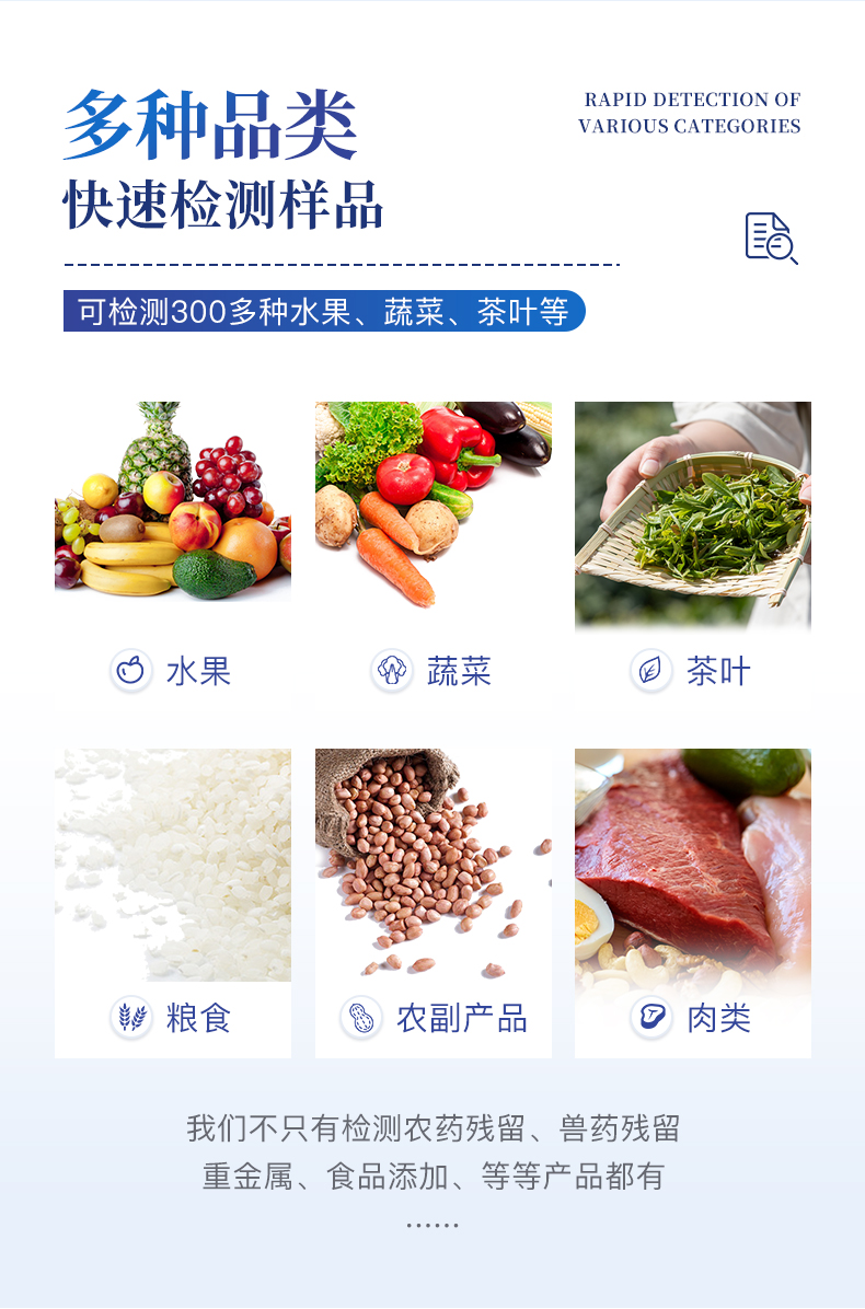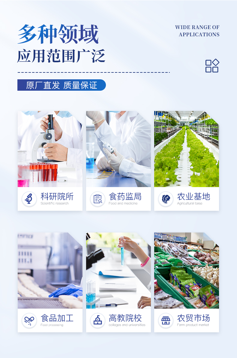 广泛应用于主要用于蔬菜、水果、茶叶、粮食、农副产品等食品中有机磷和氨基甲酸酯类农药残留的快速检测;此外还可用于果蔬茶生产基地和农贸批发销售市场现场检测,餐馆、学校、食堂、家庭果蔬加工前的安全速测等。