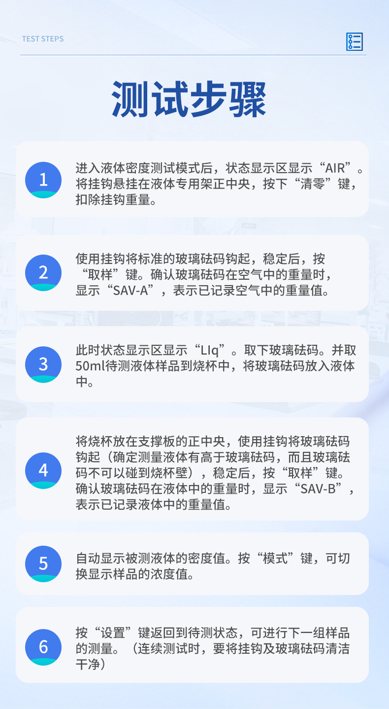 | 1、进入液体密度测试模式后,状态显示区显示“AIR”。 将挂钩悬挂在液体专用架正中央,按下“清零”键,扣除挂钩重量。 | 2、使用挂钩将标准的玻璃砝码钩起,稳定后,按“取样”键。确认玻璃砝码在空气中的重量时,显示“SAV-A”,表示已记录空气中的重量值。 | 3、此时状态显示区显示“LIq”。取下玻璃砝码。并取50ml待测液体样品到烧杯中,将玻璃砝码放入液体中。 | 4、将烧杯放在支撑板的正中央,使用挂钩将玻璃砝码钩起(确定测量液体有高于玻璃砝码,而且玻璃砝码不可以碰到烧杯壁),稳定后,按“取样”键。确认玻璃砝码在液体中的重量时,显示“SAV-B”,表示已记录液体中的重量值。 | 5、自动显示被测液体的密度值。按“模式”键,可切换显示样品的浓度值。 | 7、按“设置”键返回到待测状态,可进行下一组样品的测量。(连续测试时,要将挂钩及玻璃砝码清洁干净) | 仪器尺寸:195*220*190mm | 包装尺寸:430*200*360mm | 包装重量:4kg | 测试时间:约5秒 显示值: 密度、体积 温度补偿: 溶液温度可设定至0~100℃ 溶液补偿: 溶液可设定至19.999 |