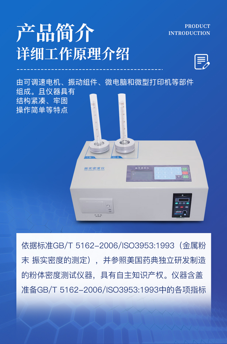 | YT-ZS2型粉体密度测试仪是由丹东市恒瑞仪器有限公司依据标准GB/T 5162-2006/ISO3953:1993(金属粉末 振实密度的测定),并参照美国药典独立研发制造的粉体密度测试仪器,具有自主知识产权。仪器含盖准备GB/T 5162-2006/ISO3953:1993中的各项指标。 | YT-ZS2型粉体密度测试仪由可调速电机、振动组件、微电脑和微型打印机等部件组成。且仪器具有结构紧凑、牢固,操作简单等特点。 |