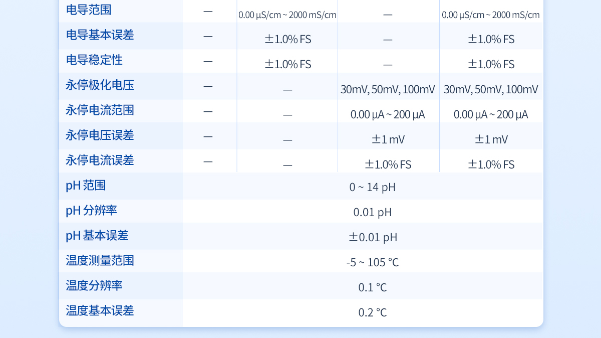 | 滴定分析重复性:≤0.2% | 滴定分析误差:≤1.5% | 10mL滴定管滴定容量精度:±5μL | 20mL滴定管滴定容量精度:±10μL | 10mL滴定管滴定容量误差:10μL/10mL | 20mL滴定管滴定容量误差:20μL/10mL | 电位范围:-2000—2000mV | 电位分辨率:0.1mV | 电位基本误差mV:±0.25‰/FS | 电位稳定性mV:±0.3mV/3h | 电导范围:0.00uS/cm-2000mS/cm | 电导基本误差:±1.0% FS | 电导稳定性:±1.0% FS | pH范围:0-14PH | pH分辨率:0.01PH | pH基本误差:±0.01PH | 温度测量范围:-5 - 105℃ | 温度分辨率:0.1℃ | 温度基本误差:0.2℃ |