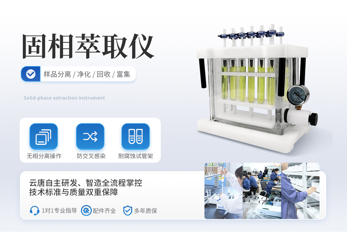 固相萃取仪是由液固萃取和液相色谱技术相结合发展而来,利用固体吸附剂将液体样品中的目标化合物吸附,与样品的基体和干扰化合物分离,然后再用洗脱液洗脱或加热解吸附,达到分离和富集目标化合物的目的(即样品的分离,净化和富集),目的在于降低样品基质干扰,提高检测灵敏度,其应用于各类食品安全检测、农产品残留监控、医药卫生、环境保护、商品检验、自来水及化工生产实验室。